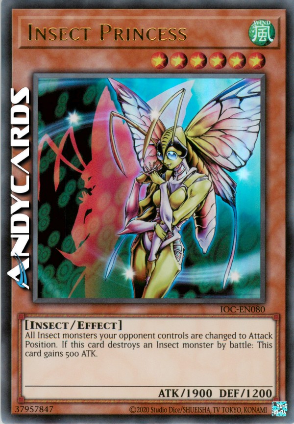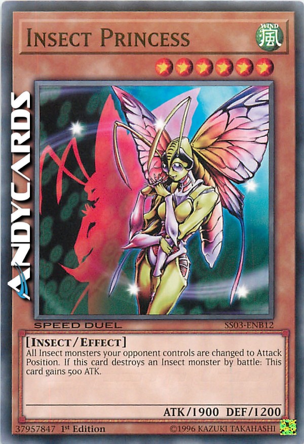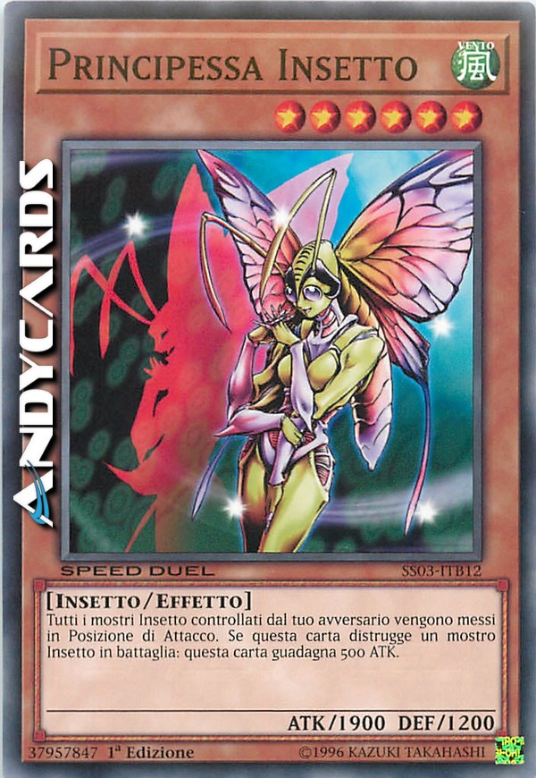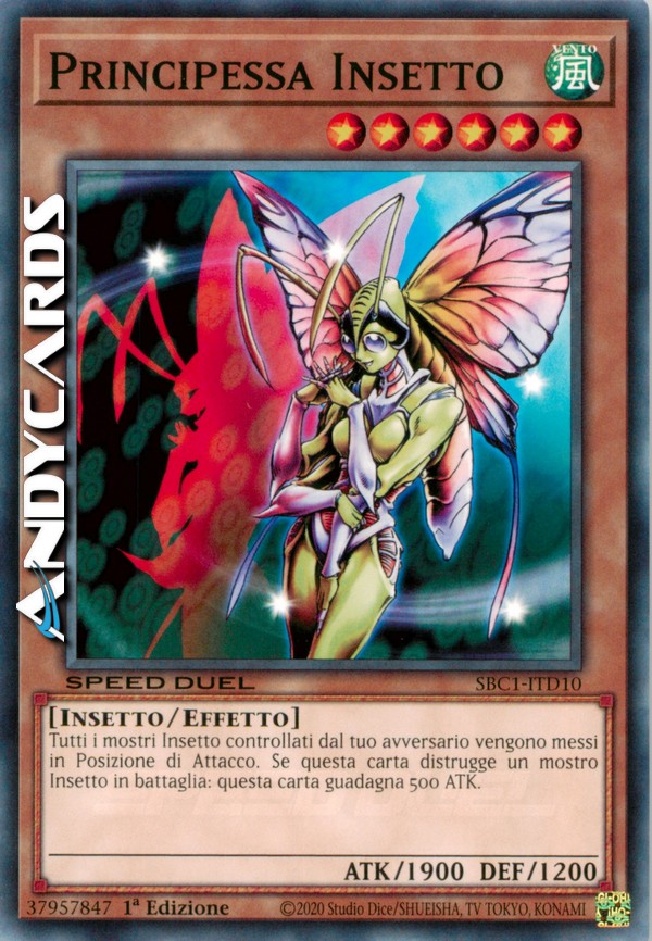 Tutti i mostri Insetto controllati dal tuo avversario vengono messi in Posizione di Attacco. Se questa carta distrugge un mostro Insetto in battaglia: questa carta guadagna 500 ATK.