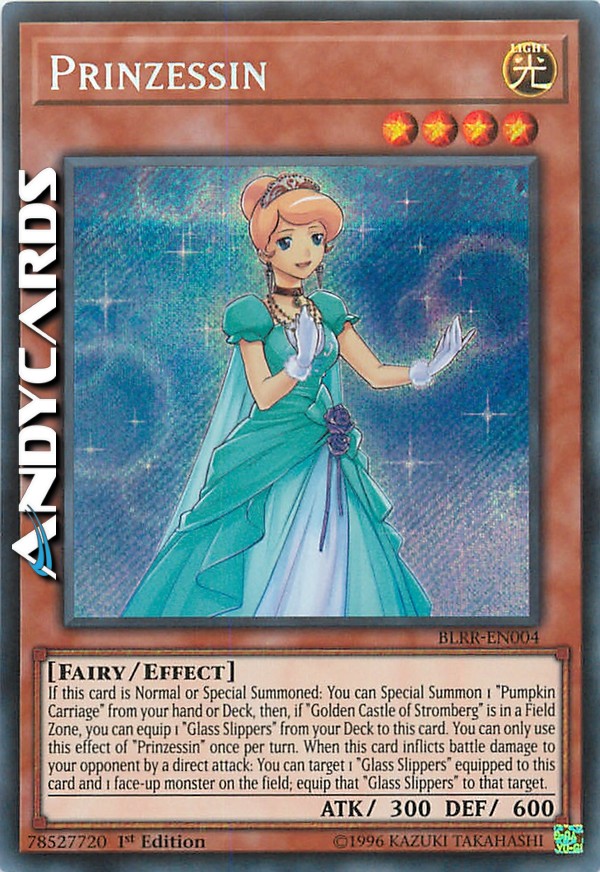 Se questa carta viene Evocata Normalmente o Specialmente: puoi Evocare Specialmente 1 "Carrozza di Zucca" dalla tua mano o Deck, poi, se "Castello Dorato di Stromberg" è in una Zona Terreno, puoi equipaggiare 1 "Scarpette di Vetro" dal tuo Deck a questa carta. Puoi utilizzare questo effetto di "Prinzessin" una sola volta per turno. Quando questa carta infligge danno da combattimento al tuo avversario con un attacco diretto: puoi scegliere come bersaglio 1 "Scarpette di Vetro" equipaggiate a questa carta e 1 mostro scoperto sul Terreno; equipaggia quelle "Scarpette di Vetro" a quel bersaglio.