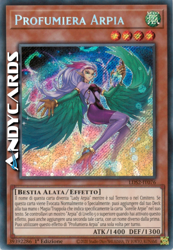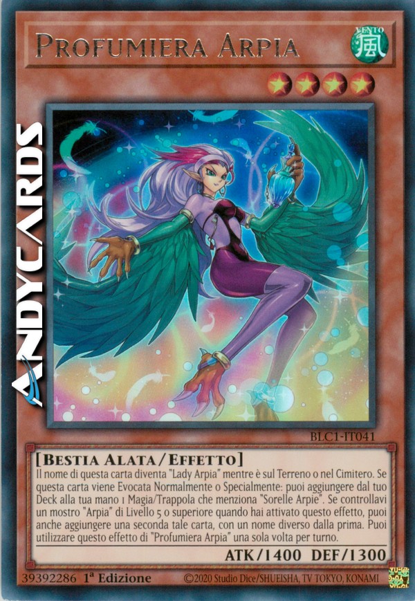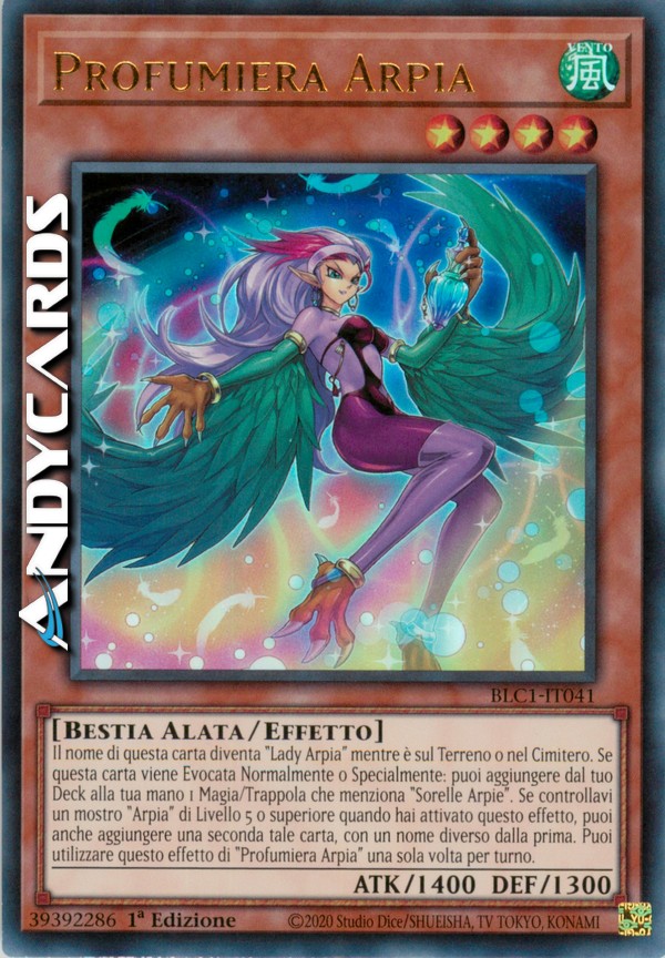 Il nome di questa carta diventa "Lady Arpia" mentre è sul Terreno o nel Cimitero. Se questa carta viene Evocata Normalmente o Specialmente: puoi aggiungere dal tuo Deck alla tua mano 1 Magia/Trappola che indica specificamente la carta "Sorelle Arpie" nel suo teso. Se controllavi un mostro "Arpia" di Livello 5 o superiore quando hai attivato questo effetto, puoi anche aggiungere una seconda tale carta, con nome diverso dalla prima. Puoi utilizzare questo effetto di "Profumiera Arpia" una sola volta per turno.