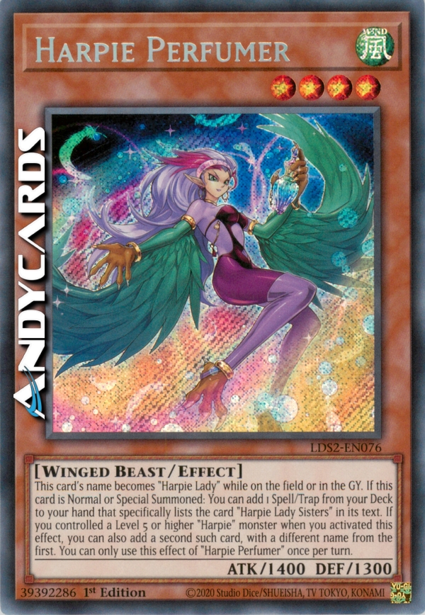 This card's name becomes "Harpie Lady" while on the field or in the GY. If this card is Normal or Special Summoned: You can add 1 Spell/Trap from your Deck to your hand that mentions "Harpie Lady Sisters". If you controlled a Level 5 or higher "Harpie" monster when you activated this effect, you can also add a second such card, with a different name from the first. You can only use this effect of "Harpie Perfumer" once per turn.