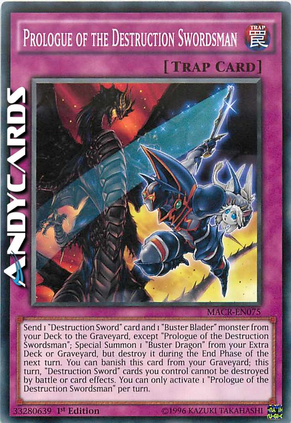 Send 1 "Destruction Sword" card and 1 "Buster Blader" monster from your Deck to the Graveyard, except "Prologue of the Destruction Swordsman"; Special Summon 1 "Buster Dragon" from your Extra Deck or Graveyard, but destroy it during the End Phase of the next turn. You can banish this card from your Graveyard; this turn, "Destruction Sword" cards you control cannot be destroyed by battle or card effects. You can only activate 1 "Prologue of the Destruction Swordsman" per turn.