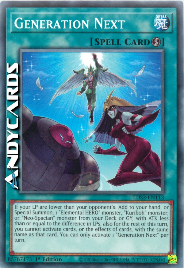 If your LP are lower than your opponent's: Add to your hand, or Special Summon, 1 "Elemental HERO" monster, "Kuriboh" monster, or "Neo-Spacian" monster from your Deck or GY, with ATK less than or equal to the difference in LPs, also for the rest of this turn, you cannot activate cards, or the effects of cards, with the same name as that card. You can only activate 1 "Generation Next" per turn.