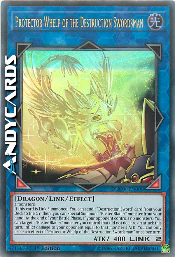 If this card is Link Summoned: You can send 1 "Destruction Sword" card from your Deck to the GY, then, you can Special Summon 1 "Buster Blader" monster from your hand. At the end of your Battle Phase, if your opponent controls no monsters: You can target 1 "Buster Blader" monster you control that did not declare an attack this turn; inflict damage to your opponent equal to that monster's ATK. You can only use each effect of "Protector Whelp of the Destruction Swordsman" once per turn.