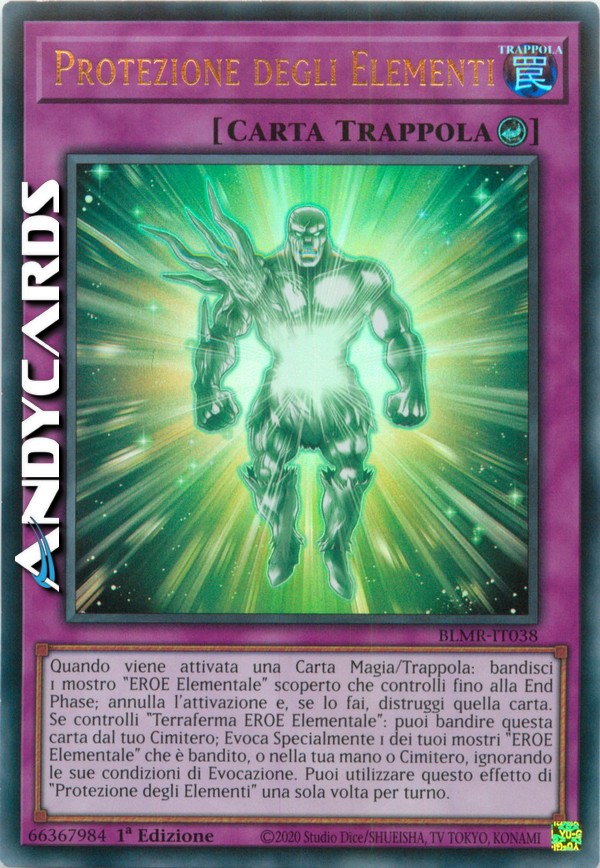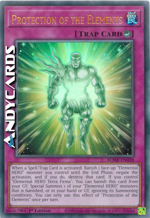 Quando viene attivata una Carta Magia/Trappola: bandisci 1 mostro "EROE Elementale" scoperto che controlli fino alla End Phase; annulla l'attivazione e, se lo fai, distruggi quella carta. Se controlli "Terraferma EROE Elementale": puoi bandire questa carta dal tuo Cimitero; Evoca Specialmente 1 dei tuoi mostri "EROE Elementale" che è bandito, o nella tua mano o Cimitero, ignorando le sue condizioni di Evocazione. Puoi utilizzare questo effetto di "Protezione degli Elementi" una sola volta per turno.