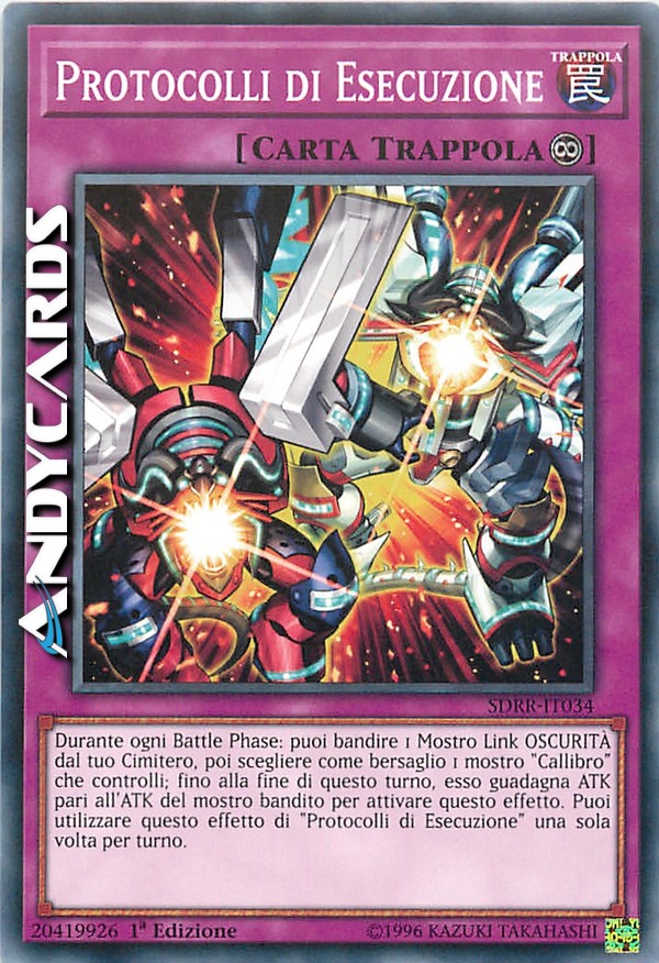 Durante ogni Battle Phase: puoi bandire 1 Mostro Link OSCURITÀ dal tuo Cimitero, poi scegliere come bersaglio 1 mostro "Callibro" che controlli; fino alla fine di questo turno, esso guadagna ATK pari all'ATK del mostro bandito per attivare questo effetto. Puoi utilizzare questo effetto di "Protocolli di Esecuzione" una sola volta per turno.