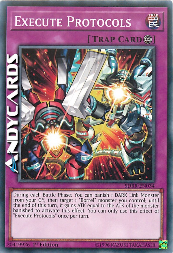 During each Battle Phase: You can banish 1 DARK Link Monster from your GY, then target 1 "Borrel" monster you control; until the end of this turn, it gains ATK equal to the ATK of the monster banished to activate this effect. You can only use this effect of "Execute Protocols" once per turn.