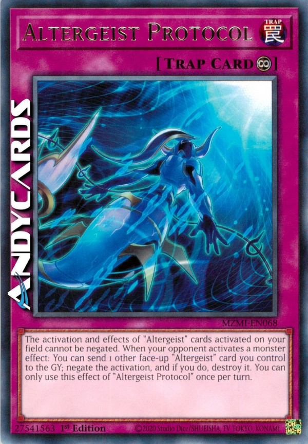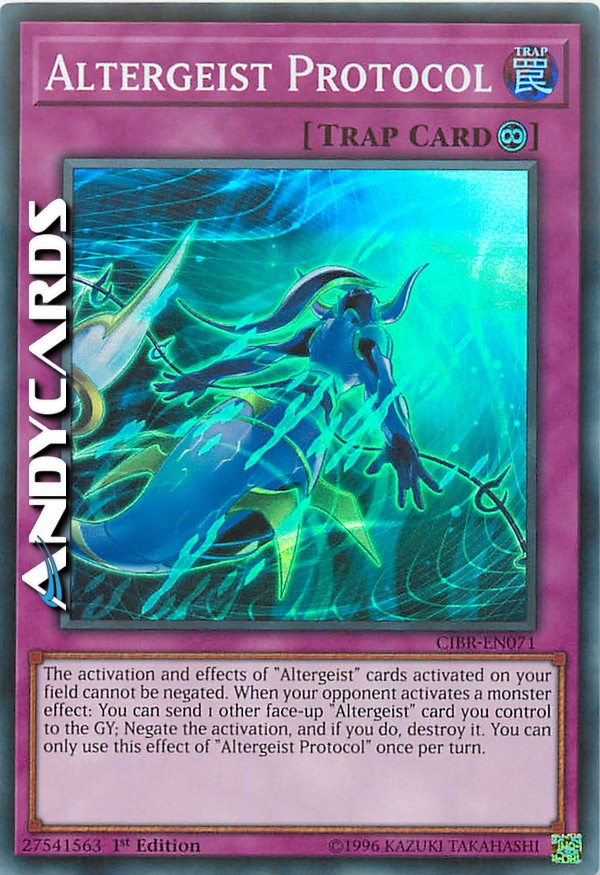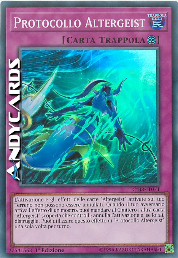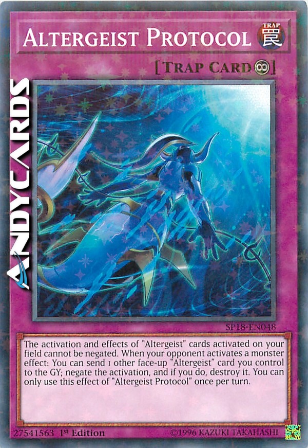 L'attivazione e gli effetti delle carte "Altergeist" attivate sul tuo Terreno non possono essere annullati. Quando il tuo avversario attiva l'effetto di un mostro: puoi mandare al Cimitero 1 altra carta "Altergeist" scoperta che controlli; annulla l'attivazione e, se lo fai, distruggila. Puoi utilizzare questo effetto di "Protocollo Altergeist" una sola volta per turno.