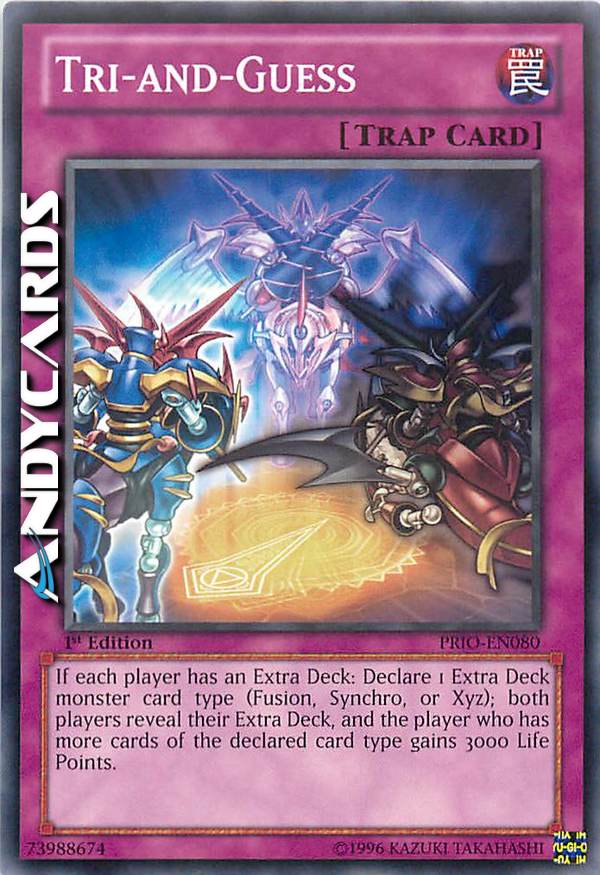 Se ogni giocatore ha un Extra deck: dichiara 1 Tipo di carta mostro da Extra Deck (Fusione,Synchro, Xyz); entrambi i giocatori rivelano il loro Extra Deck, e il giocatore che ha più carte del tipo di carta dichiarato guadagna 3000 Life Point.