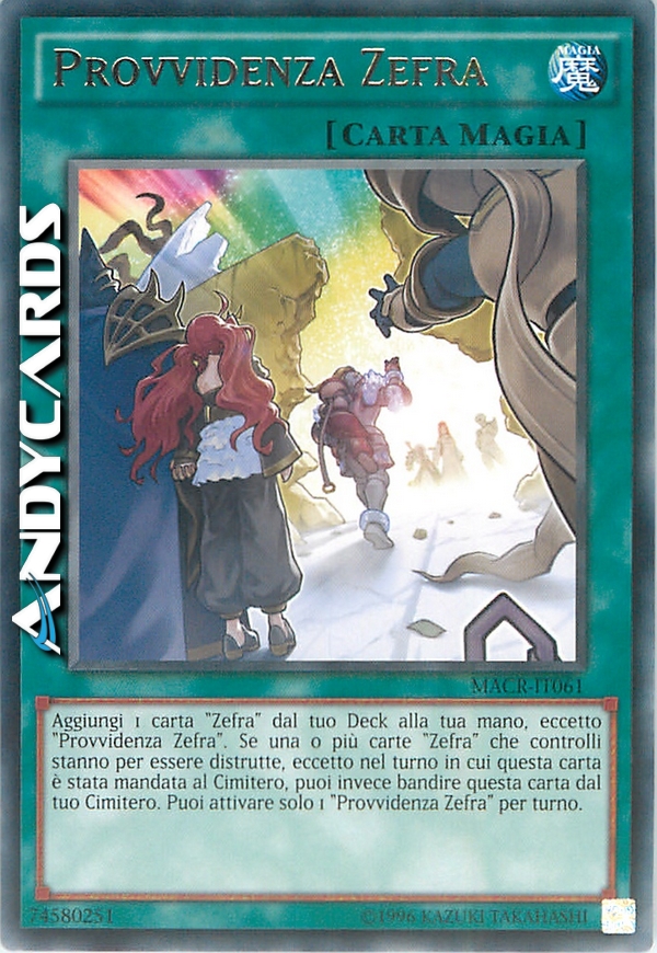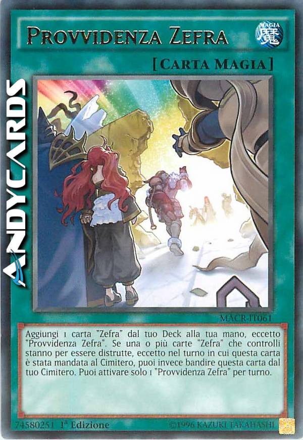 Aggiungi 1 carta "Zefra" dal tuo Deck alla tua mano, eccetto "Provvidenza Zefra". Se una o più carte "Zefra" che controlli stanno per essere distrutte, eccetto nel turno in cui questa carta è stata mandata al Cimitero, puoi invece bandire questa carta dal tuo Cimitero. Puoi attivare solo 1 "Provvidenza Zefra" per turno.