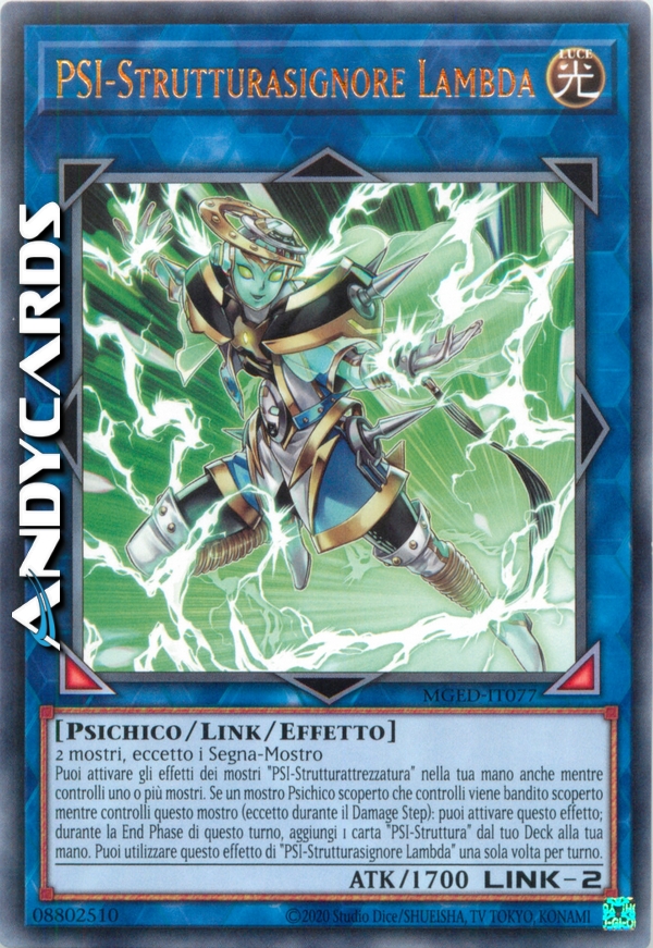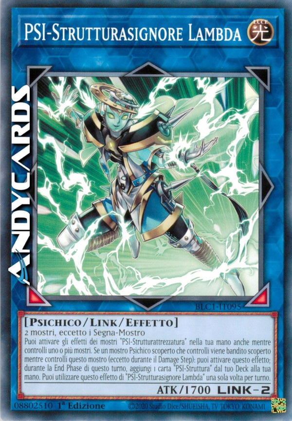 Puoi attivare gli effetti dei mostri "PSI-Strutturattrezzatura" nella tua mano anche mentre controlli uno o più mostri. Se un mostro Psichico scoperto che controlli viene bandito scoperto mentre controlli questo mostro (eccetto durante il Damage Step): puoi attivare questo effetto; durante la End Phase di questo turno, aggiungi 1 carta "PSI-Struttura" dal tuo Deck alla tua mano. Puoi utilizzare questo effetto di "PSI-Strutturasignore Lambda" una sola volta per turno.