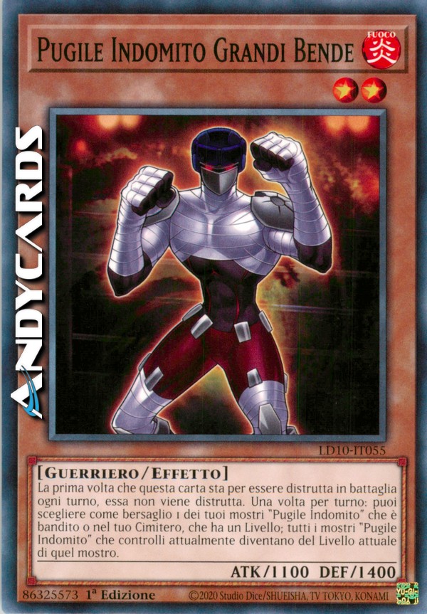 Una volta per turno, questa carta non può essere distrutta in battaglia. Una volta per turno: puoi scegliere come bersaglio 1 mostro "Pugile Indomito" nel tuo Cimitero, o 1 dei tuoi mostri "Pugile Indomito" banditi, che ha un Livello; tutti i mostri "Pugile Indomito" che controlli attualmente diventano del Livello attuale di quel mostro.