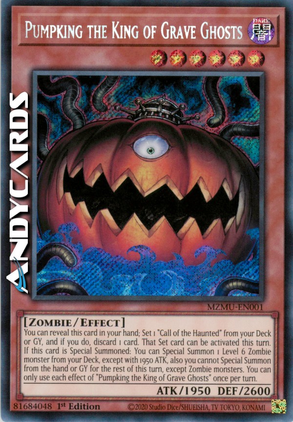 You can reveal this card in your hand; Set 1 "Call of the Haunted" from your Deck or GY, and if you do, discard 1 card. That Set card can be activated this turn. If this card is Special Summoned: You can Special Summon 1 Level 6 Zombie monster from your Deck, except with 1950 ATK, also you cannot Special Summon from the hand or GY for the rest of this turn, except Zombie monsters. You can only use each effect of "Pumpking the King of Grave Ghosts" once per turn.