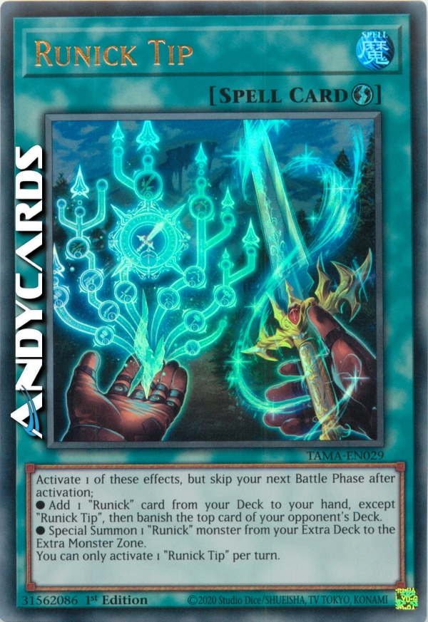 ●Aggiungi 1 carta "Runick" dal tuo Deck alla tua mano, eccetto "Punta Runick", poi bandisci la prima carta del Deck del tuo avversario.