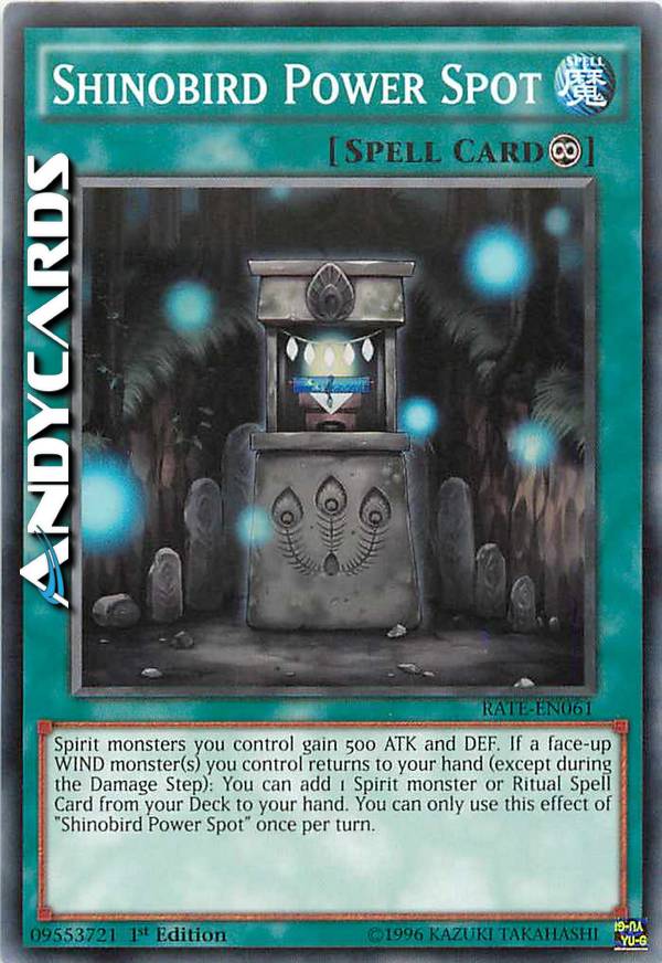 Spirit monsters you control gain 500 ATK and DEF. If a face-up WIND monster(s) you control returns to your hand (except during the Damage Step): You can add 1 Spirit monster or Ritual Spell Card from your Deck to your hand. You can only use this effect of "Shinobird Power Spot" once per turn.