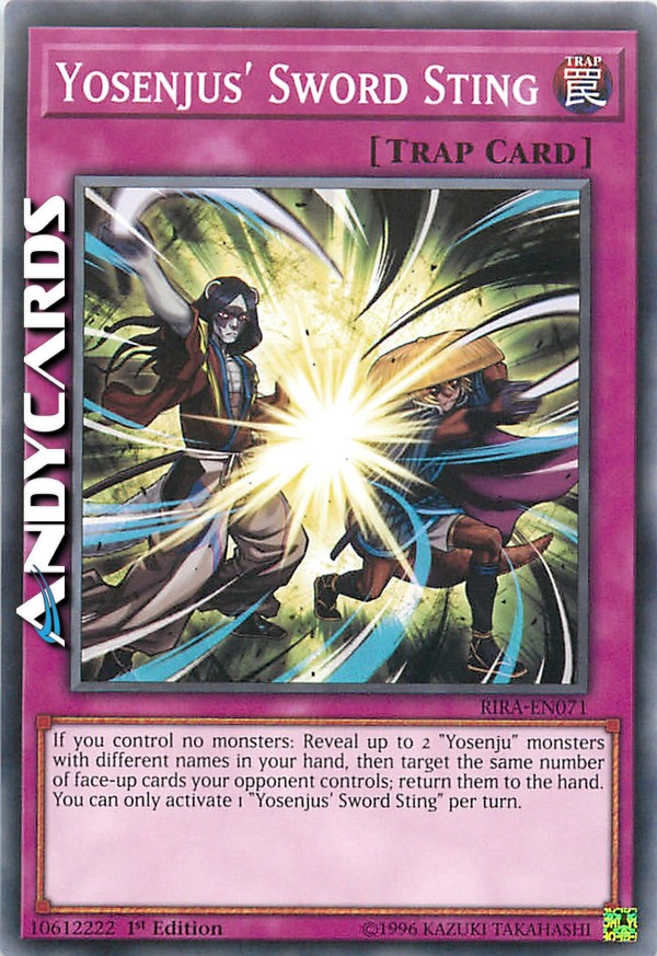 Se non controlli nessun mostro: rivela fino a 2 mostri "Yosenju" con nomi diversi nella tua mano, poi scegli come bersaglio lo stesso numero di carte scoperte controllate dal tuo avversario; falle ritornare nella mano. Puoi attivare solo 1 "Puntura di Spada Yosenju" per turno.