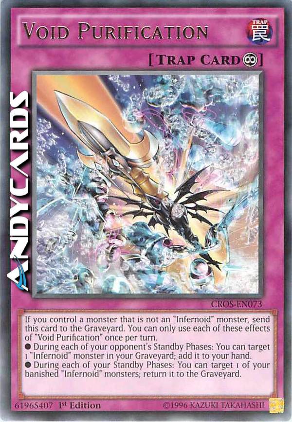 Se controlli un mostro che non è un mostro "Infernoid", manda questa carta al Cimitero. Puoi utilizzare ognuno di questi effetti di "Purificazione del Vuoto" una sola volta per turno. ?Durante ogni Standby Phase del tuo avversario: puoi scegliere come bersaglio 1 mostro "Infernoid" nel tuo Cimitero; aggiungilo alla tua mano. ?Durante ogni tua Standby Phase: puoi scegliere come bersaglio 1 dei tuoi mostri "Infernoid" banditi; fallo ritornare nel Cimitero.