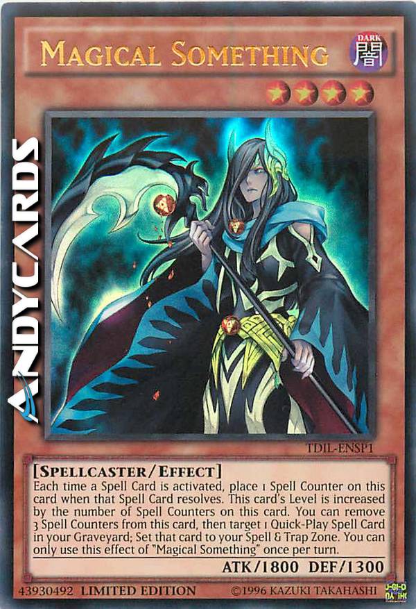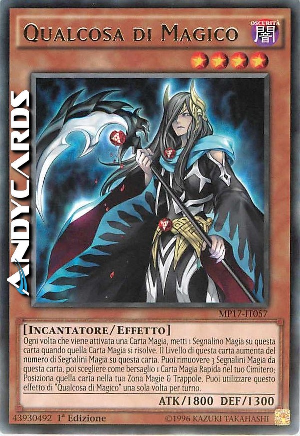 Ogni volta che viene attivata una Carta Magia, metti 1 Segnalino Magia su questa carta quando quella Carta Magia si risolve. Il Livello di questa carta aumenta del numero di Segnalini Magia su questa carta. Puoi rimuovere 3 Segnalini Magia da questa carta, poi scegliere come bersaglio 1 Carta Magia Rapida nel tuo Cimitero; Posiziona quella carta nella tua Zona Magie & Trappole. Puoi utilizzare questo effetto di "Qualcosa di Magico" una sola volta per turno.