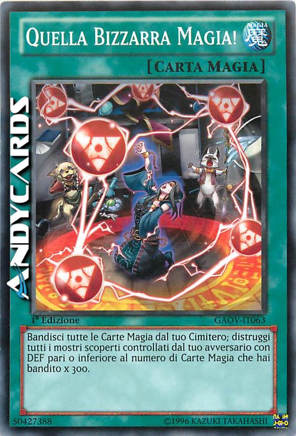 Bandisci tutte le Carte Magia dal tuo Cimitero; distruggi tutti i mostri scoperti controllati dal tuo avversario con DEF pari o inferiore al numero di Carte Magia che hai bandito x 300.
