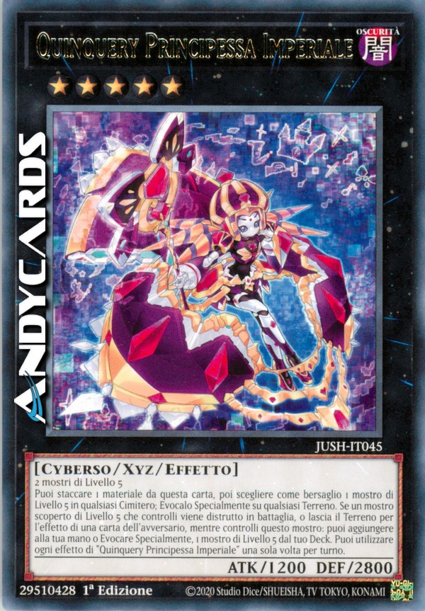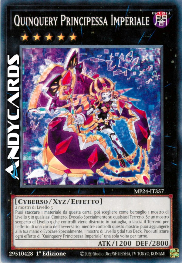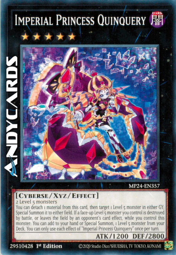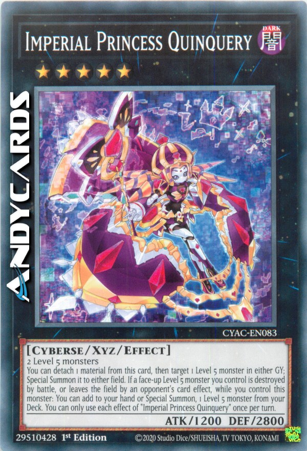 Puoi staccare 1 materiale da questa carta, poi scegliere come bersaglio 1 mostro di Livello 5 in qualsiasi Cimitero; Evocalo Specialmente su qualsiasi Terreno. Se un mostro scoperto di Livello 5 che controlli viene distrutto in battaglia, o lascia il Terreno per l'effetto di una carta dell'avversario, mentre controlli questo mostro: puoi aggiungere alla tua mano o Evocare Specialmente, 1 mostro di Livello 5 dal tuo Deck. Puoi utilizzare ogni effetto di "Quinquery Principessa Imperiale" una sola volta per turno.