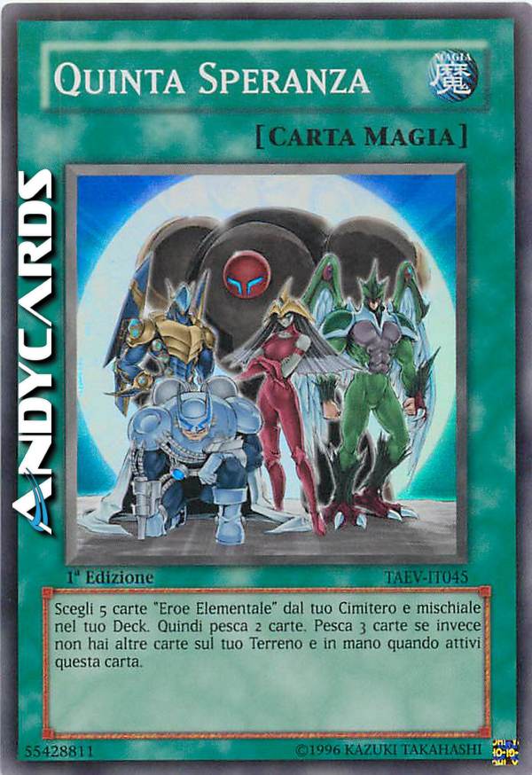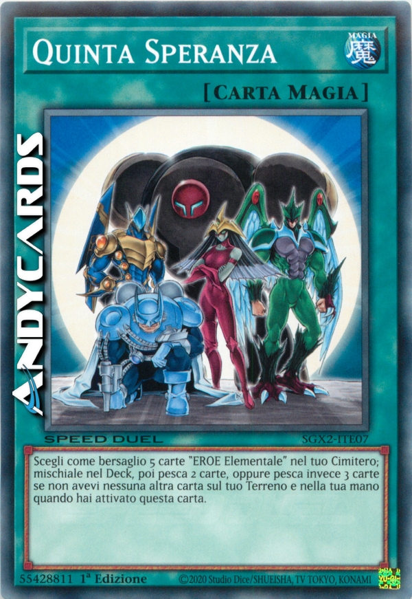 Scegli come bersaglio 5 carte "EROE Elementale" nel tuo Cimitero; mischiale nel Deck, poi pesca 2 carte (pesca invece 3 carte se non avevi altre carte sul tuo Terreno e in mano quando hai attivato questa carta).