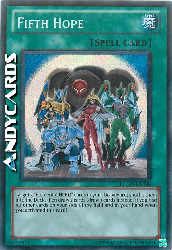 Select 5 "Elemental Hero" cards from your Graveyard and shuffle them into the Deck. Then draw 2 cards. Draw 3 cards instead if you had no other cards on your side of the field and in your hand when you activated this card.