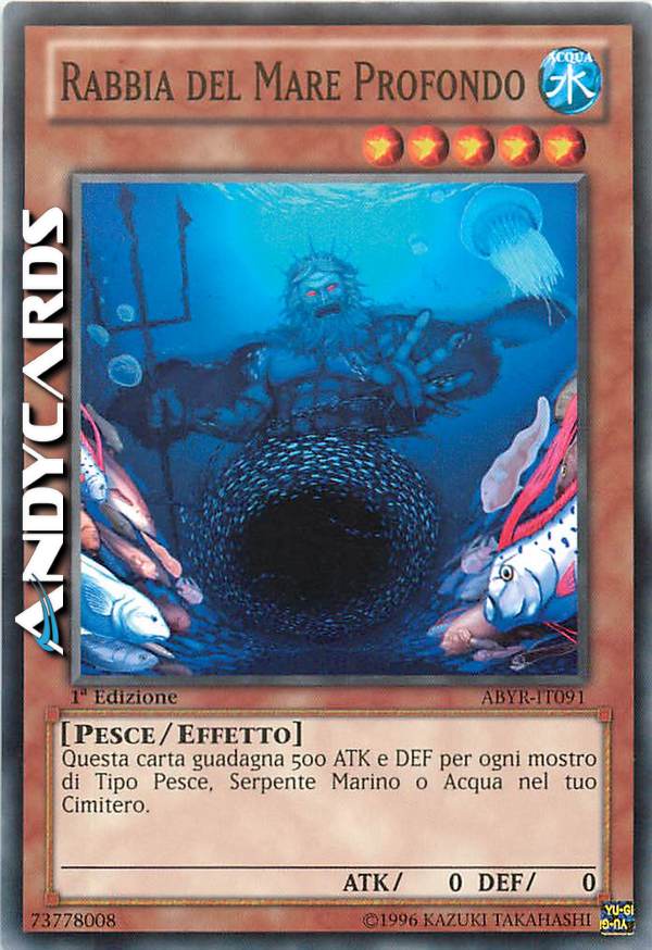 Questa carta guadagna 500 ATK e DEF per ogni mostro di Tipo Pesce, Serpente Marino o Acqua nel tuo Cimitero.