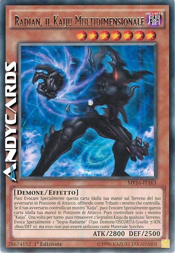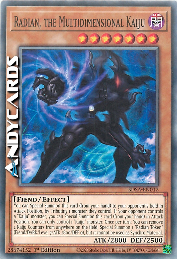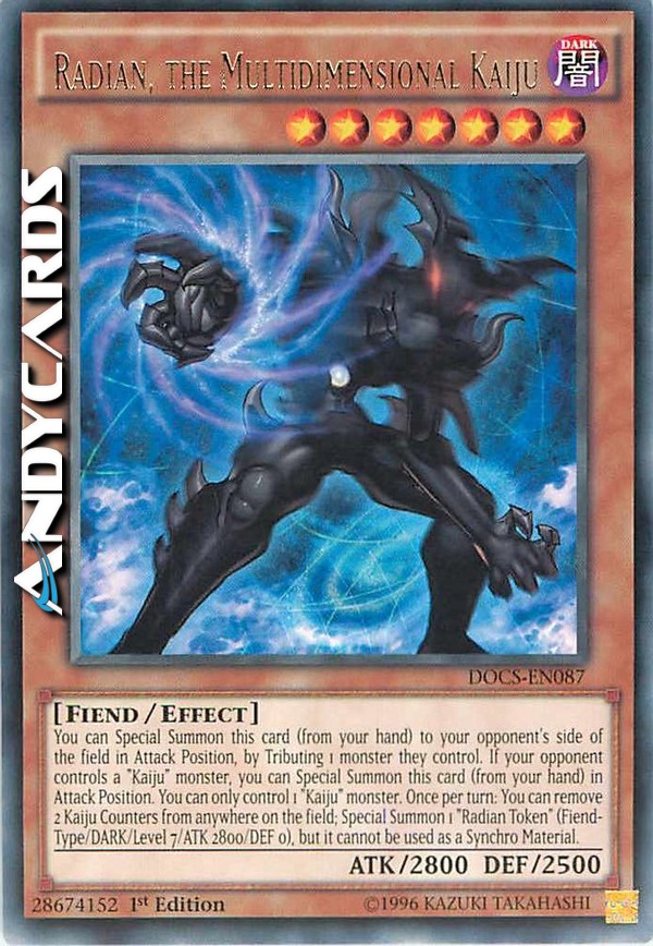 You can Special Summon this card (from your hand) to your opponent's field in Attack Position, by Tributing 1 monster they control. If your opponent controls a "Kaiju" monster, you can Special Summon this card (from your hand) in Attack Position. You can only control 1 "Kaiju" monster. Once per turn: You can remove 2 Kaiju Counters from anywhere on the field; Special Summon 1 "Radian Token" (Fiend/DARK/Level 7/ATK 2800/DEF 0), but it cannot be used as Synchro Material.