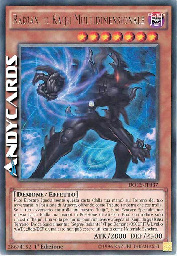 Puoi Evocare Specialmente questa carta (dalla tua mano) sul Terreno del tuo avversario in Posizione di Attacco, offrendo come Tributo 1 mostro che controlla. Se il tuo avversario controlla un mostro "Kaiju", puoi Evocare Specialmente questa carta (dalla tua mano) in Posizione di Attacco. Puoi controllare solo 1 mostro "Kaiju". Una volta per turno: puoi rimuovere 2 Segnalini Kaiju da qualsiasi Terreno; Evoca Specialmente 1 "Segna-Radiante" (Tipo Demone/OSCURITÀ/Livello 7/ATK 2800/DEF 0), ma esso non può essere utilizzato come Materiale Synchro.