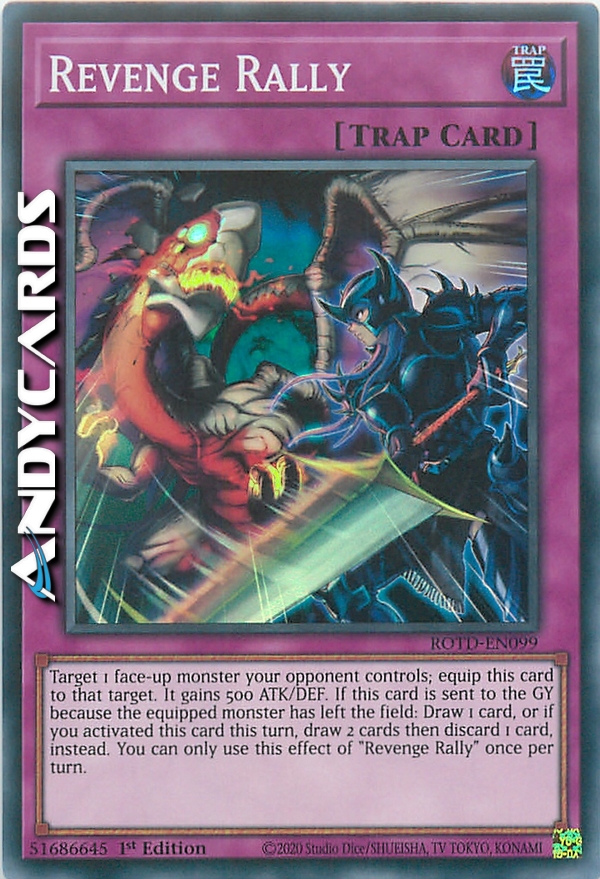 Scegli come bersaglio 1 mostro scoperto controllato dal tuo avversario; equipaggia questa carta a quel bersaglio. Esso guadagna 500 ATK/DEF. Se questa carta viene mandata al Cimitero perché il mostro equipaggiato ha lasciato il Terreno: pesca 1 carta o, se hai attivato questa carta in questo turno, pesca invece 2 carte, poi scarta 1 carta. Puoi utilizzare questo effetto di "Raduno di Vendetta" una sola volta per turno.