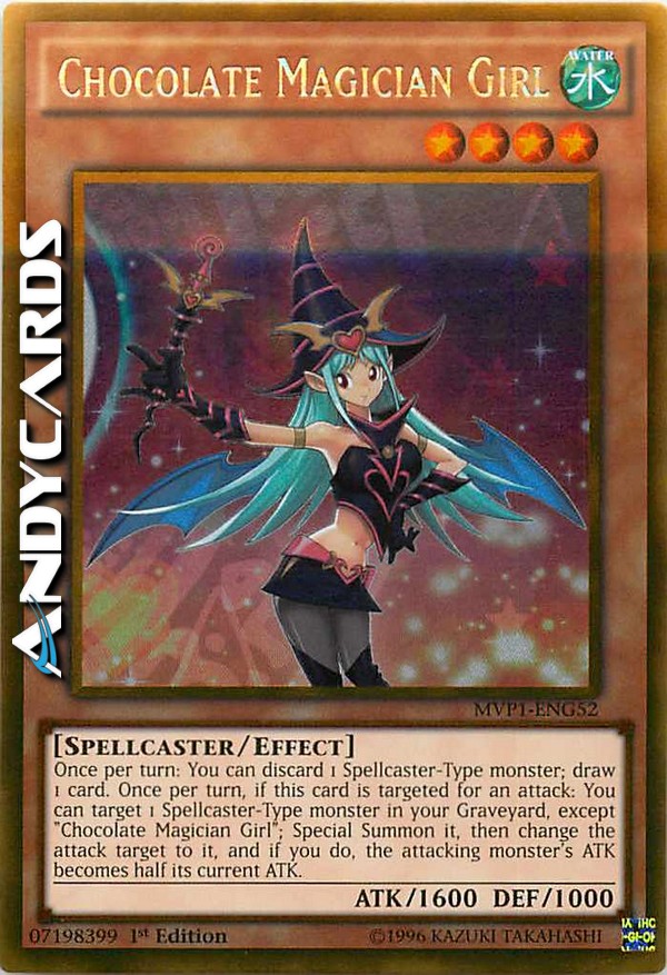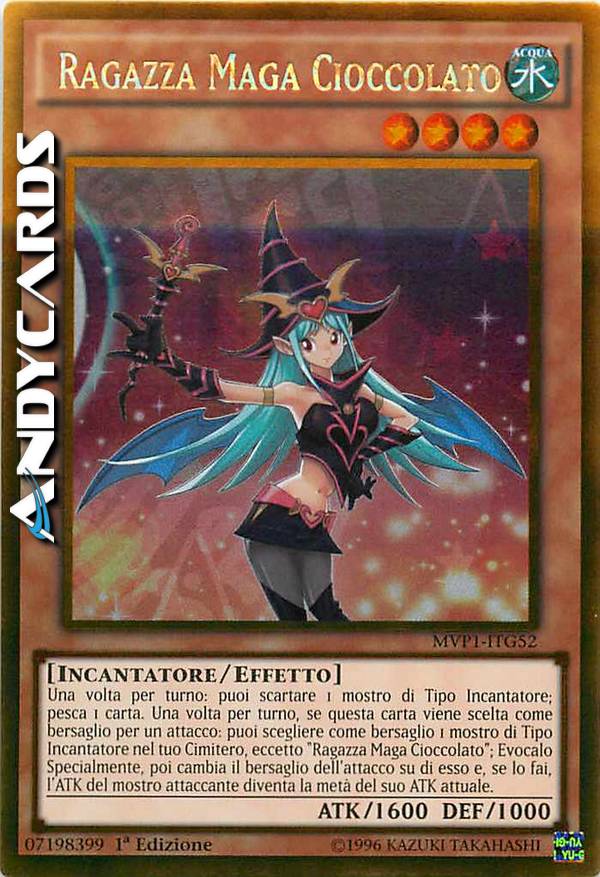 Una volta per turno: puoi scartare 1 mostro di Tipo Incantatore; pesca 1 carta. Una volta per turno, se questa carta viene scelta come bersaglio per un attacco: puoi scegliere come bersaglio 1 mostro di Tipo Incantatore nel tuo Cimitero, eccetto "Ragazza Maga Cioccolato"; Evocalo Specialmente, poi cambia il bersaglio dell'attacco su di esso e, se lo fai, l'ATK del mostro attaccante diventa la metà del suo ATK attuale.