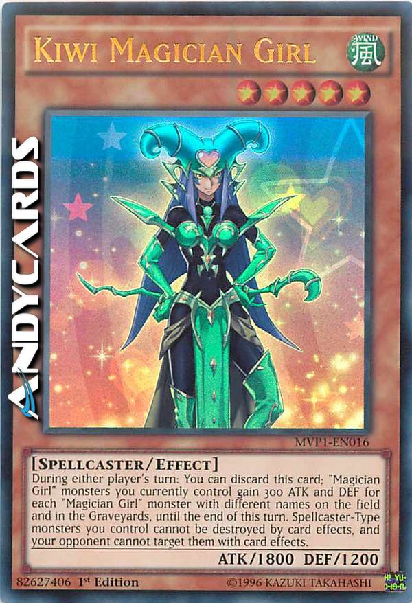 During either player's turn: You can discard this card; "Magician Girl" monsters you currently control gain 300 ATK and DEF for each "Magician Girl" monster with different names on the field and in the Graveyards, until the end of this turn. Spellcaster-Type monsters you control cannot be destroyed by card effects, and your opponent cannot target them with card effects.