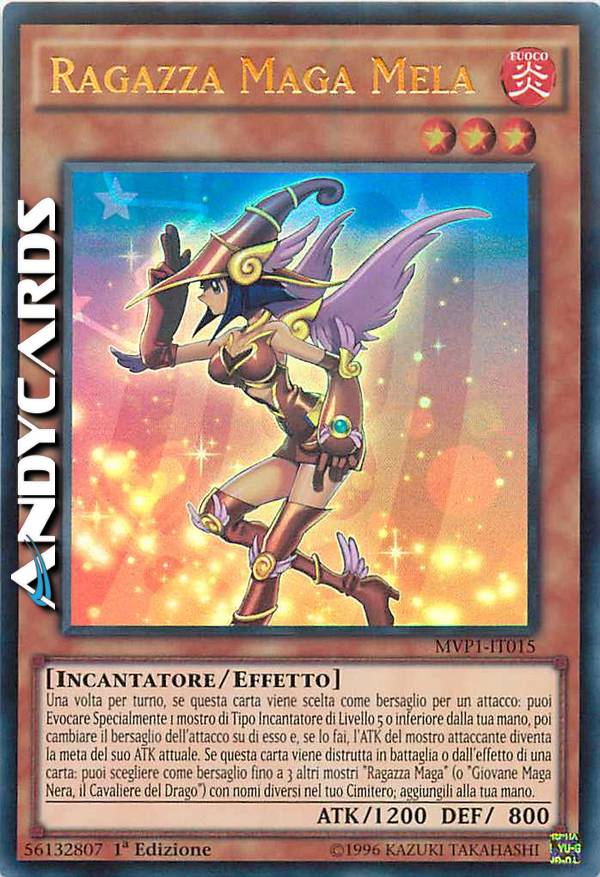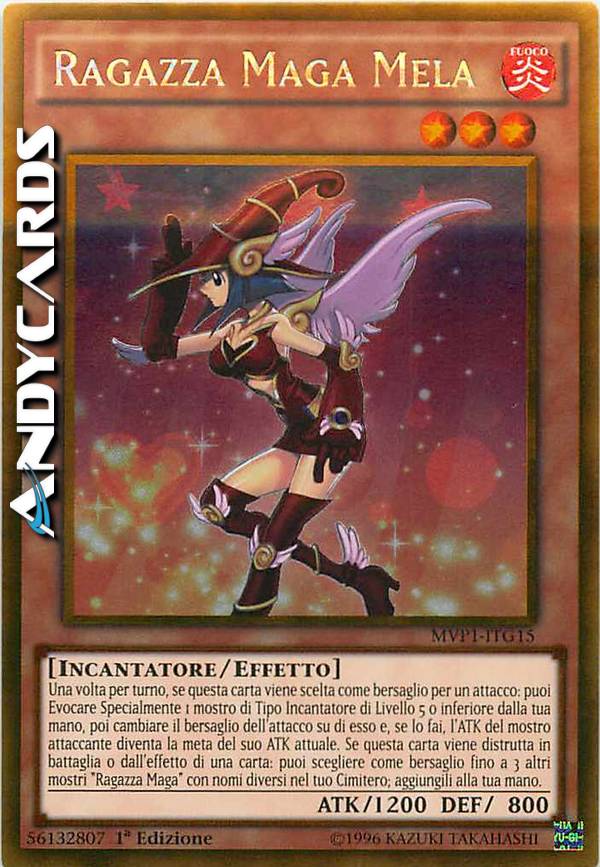 Una volta per turno, se questa carta viene scelta come bersaglio per un attacco: puoi Evocare Specialmente 1 mostro di Tipo Incantatore di Livello 5 o inferiore dalla tua mano, poi cambiare il bersaglio dell'attacco su di esso e, se lo fai, l'ATK del mostro attaccante diventa la meta del suo ATK attuale. Se questa carta viene distrutta in battaglia o dall'effetto di una carta: puoi scegliere come bersaglio fino a 3 altri mostri "Ragazza Maga" con nomi diversi nel tuo Cimitero; aggiungili alla tua mano.