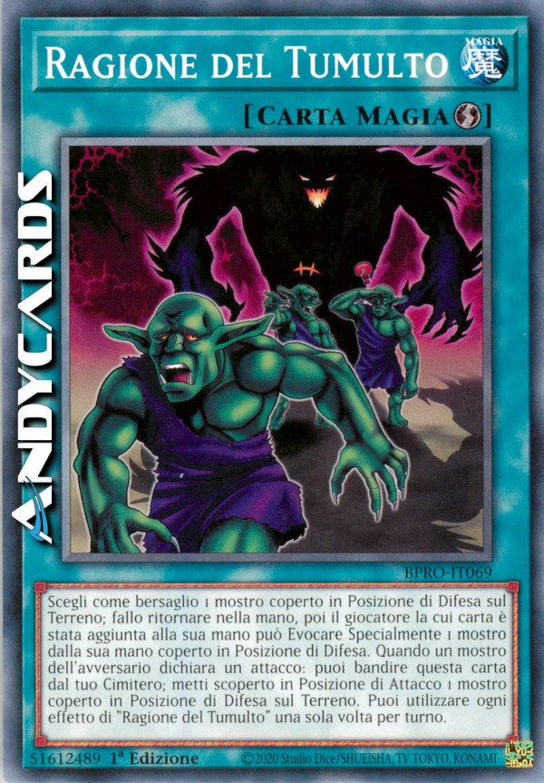 Scegli come bersaglio 1 mostro coperto in Posizione di Difesa sul Terreno; fallo ritornare nella mano, poi il giocatore la cui carta è stata aggiunta alla sua mano può Evocare Specialmente 1 mostro dalla sua mano coperto in Posizione di Difesa. Quando un mostro dell'avversario dichiara un attacco: puoi bandire questa carta dal tuo Cimitero; metti scoperto in Posizione di Attacco 1 mostro coperto in Posizione di Difesa sul Terreno. Puoi utilizzare ogni effetto di "Ragione del Tumulto" una sola volta per turno.