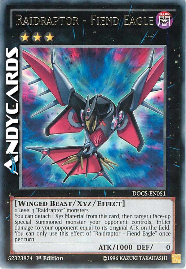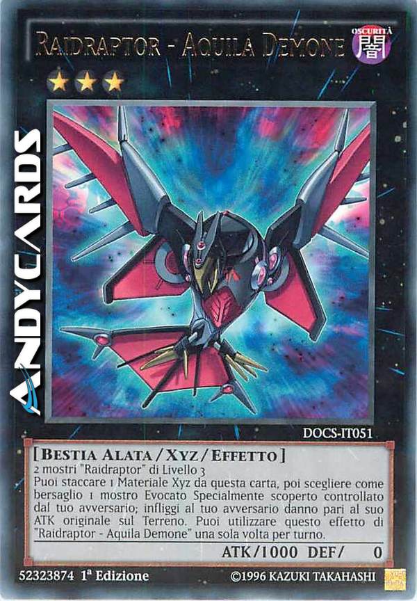 2 mostri "Raidraptor" di Livello 3 Puoi staccare 1 Materiale Xyz da questa carta, poi scegliere come bersaglio 1 mostro Evocato Specialmente scoperto controllato dal tuo avversario; infliggi al tuo avversario danno pari al suo ATK originale sul Terreno. Puoi utilizzare questo effetto di "Raidraptor - Aquila Demone" una sola volta per turno.