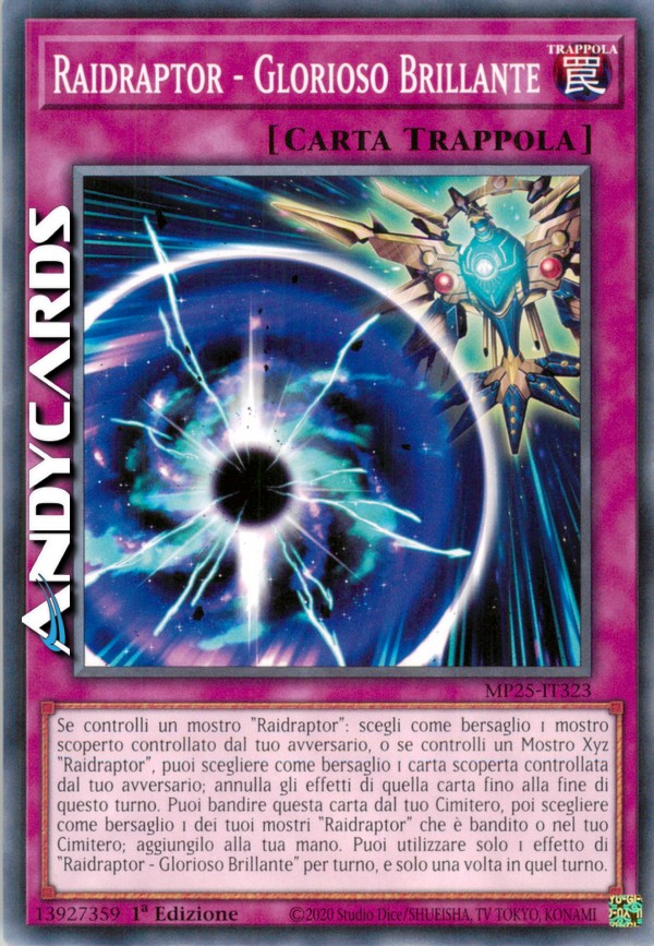 Se controlli un mostro "Raidraptor": scegli come bersaglio 1 mostro scoperto controllato dal tuo avversario, o se controlli un Mostro Xyz "Raidraptor", puoi scegliere come bersaglio 1 carta scoperta controllata dal tuo avversario; annulla gli effetti di quella carta fino alla fine di questo turno. Puoi bandire questa carta dal tuo Cimitero, poi scegliere come bersaglio 1 dei tuoi mostri "Raidraptor" che è bandito o nel tuo Cimitero; aggiungilo alla tua mano. Puoi utilizzare solo 1 effetto di "Raidraptor - Glorioso Brillante" per turno, e solo una volta in quel turno.
