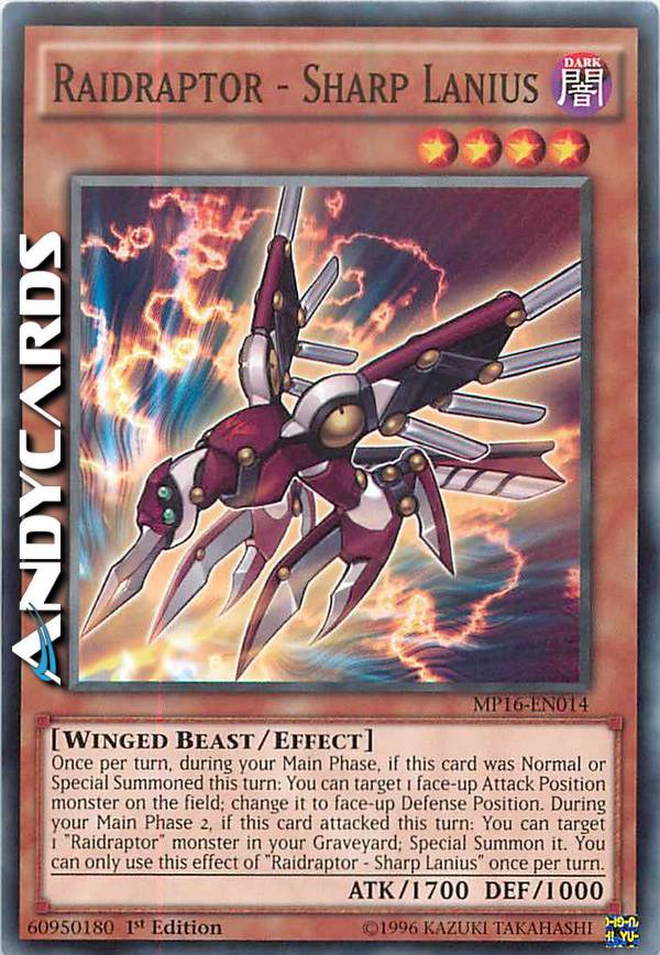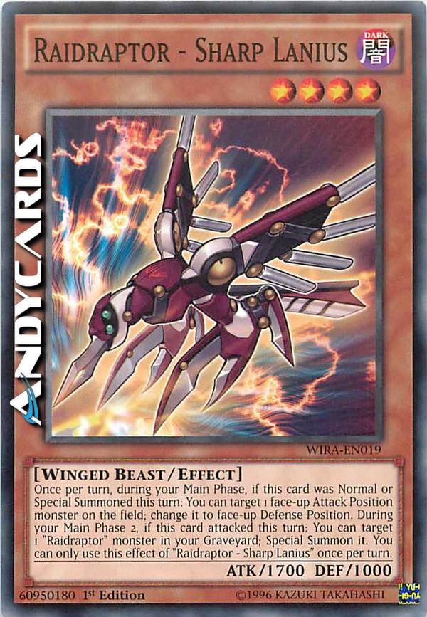 Once per turn, during your Main Phase, if this card was Normal or Special Summoned this turn: You can target 1 face-up Attack Position monster on the field; change it to face-up Defense Position. During your Main Phase 2 if this card attacked this turn: You can target 1 "Raidraptor" monster in your Graveyard; Special Summon it. You can only use this effect of "Raidraptor Sharp Lanius" once per turn.