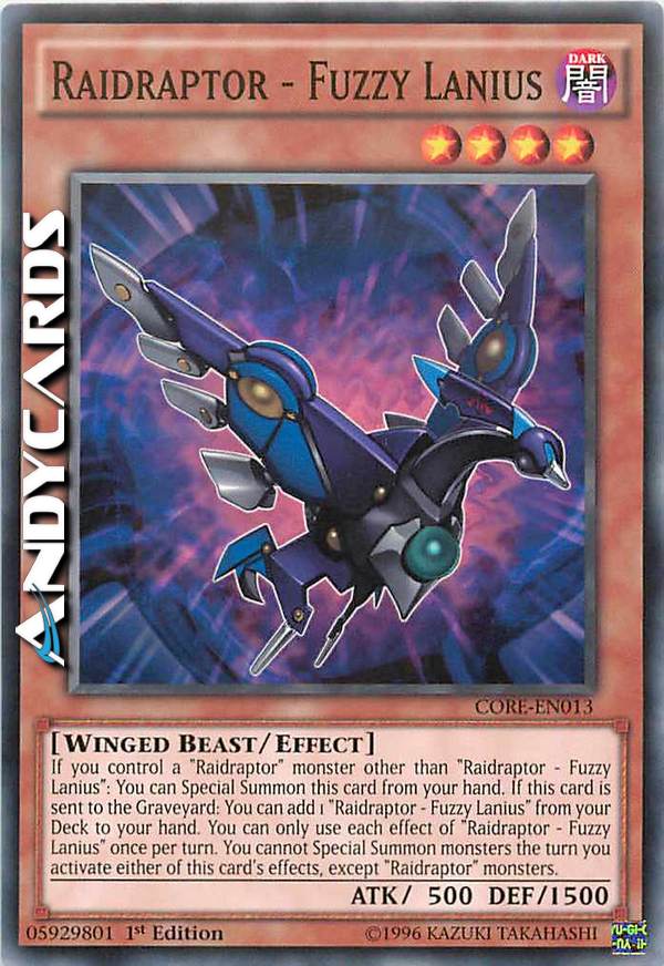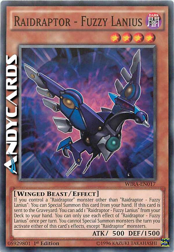 If you control a "Raidraptor" monster other than "Raidraptor - Fuzzy Lanius": You can Special Summon this card from your hand. If this card is sent to the Graveyard: You can add 1 "Raidraptor - Fuzzy Lanius" from your Deck to your hand. You can only use each effect of "Raidraptor - Fuzzy Lanius" once per turn. You cannot Special Summon monsters the turn you activate either of this card's effects, except "Raidraptro" monsters.
