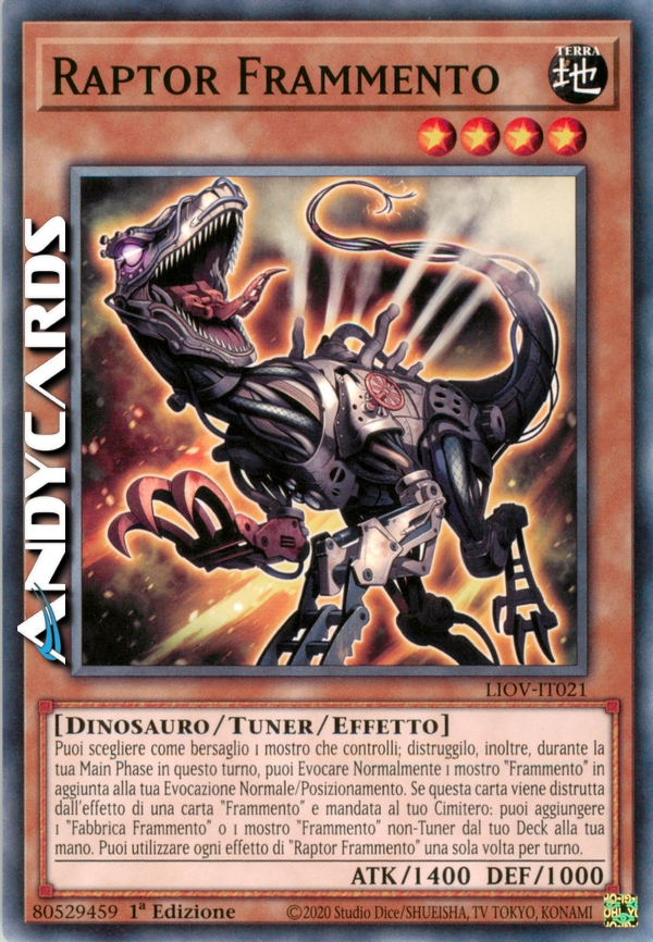 Puoi scegliere come bersaglio 1 mostro che controlli; distruggilo, inoltre, durante la tua Main Phase in questo turno, puoi Evocare Normalmente 1 mostro "Frammento" in aggiunta alla tua Evocazione Normale/Posizionamento. Se questa carta viene distrutta dall'effetto di una carta "Frammento" e mandata al tuo Cimitero: puoi aggiungere 1 "Fabbrica Frammento" o 1 mostro "Frammento" non-Tuner dal tuo Deck alla tua mano. Puoi utilizzare ogni effetto di "Raptor Frammento" una sola volta per turno.