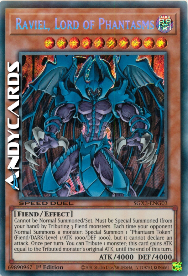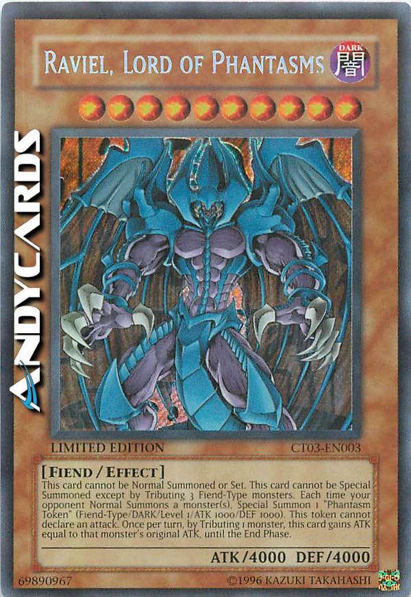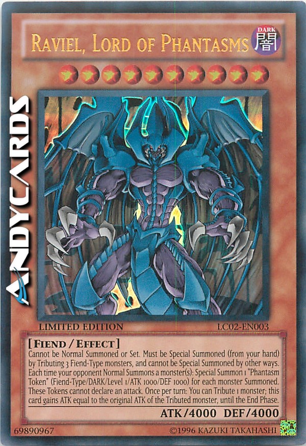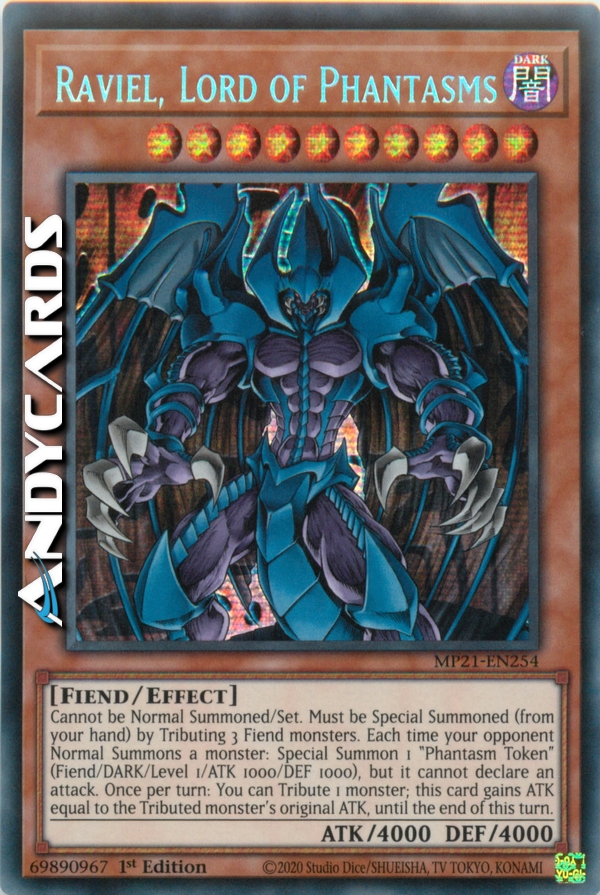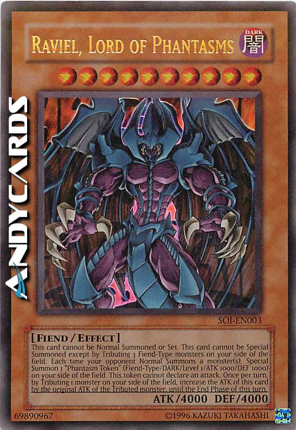 Cannot be Normal Summoned/Set. Must be Special Summoned (from your hand) by Tributing 3 Fiend monsters. Each time your opponent Normal Summons a monster: Special Summon 1 "Phantasm Token" (Fiend/DARK/Level 1/ATK 1000/DEF 1000), but it cannot declare an attack. Once per turn: You can Tribute 1 monster; this card gains ATK equal to the Tributed monster's original ATK, until the end of this turn.