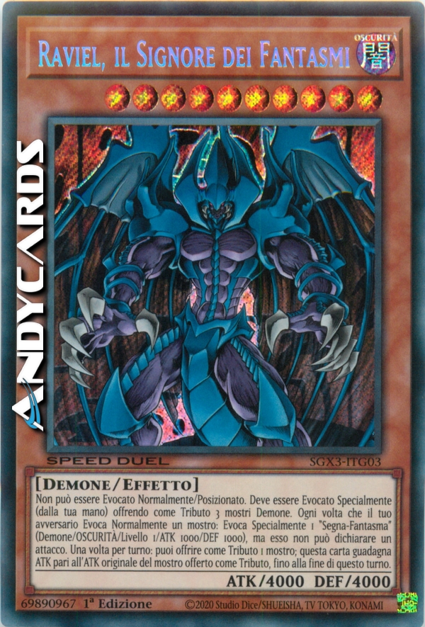 Questa carta non può essere Evocata tramite Evocazione Normale o Posizionata. Questa carta non può essere Evocata tramite Evocazione Speciale se non offrendo come Tributo 3 mostri di Tipo Demone sul tuo Terreno. Ogni volta che il tuo avversario Evoca tramite evocazione Normale uno o più mostri, Evoca tramite Evocazione Speciale 1 "Segna-Fantasma" (Tipo Demone/OSCURITA'/Livello 1/ATK 1000/DEF 1000) sul tuo Terreno. Questo Segna-Mostro non può dichiarare un attacco. Una volta per turno, offri come Tributo 1 mostro sul tuo Terreno per aumentare l'ATK di questa carta dell'ATK originale del mostro offerto in Tributo, fino alla End Phase di questo turno.