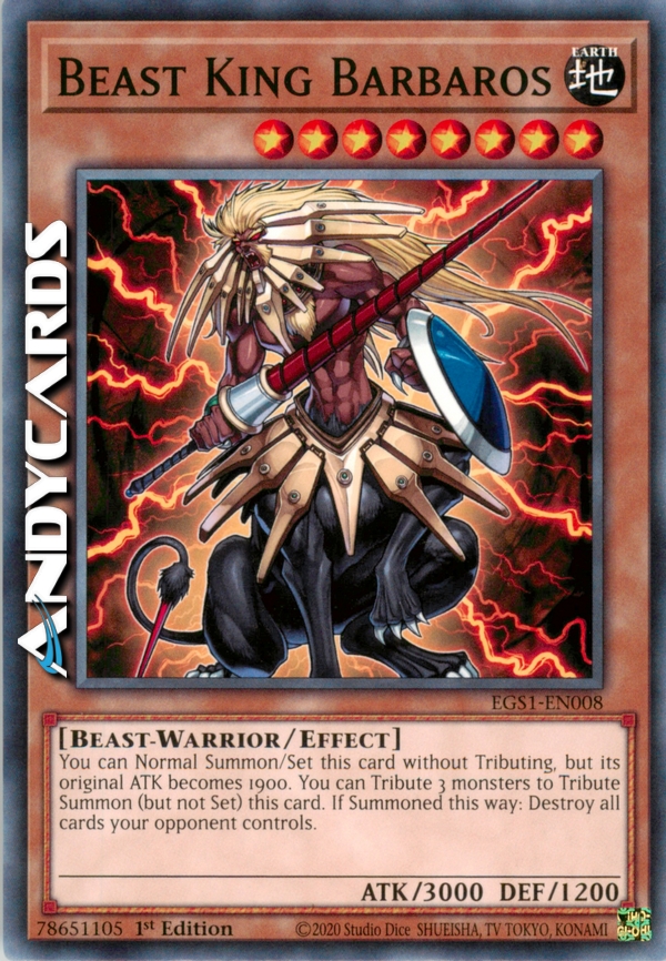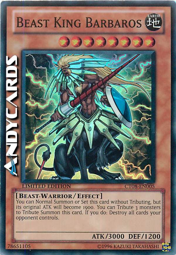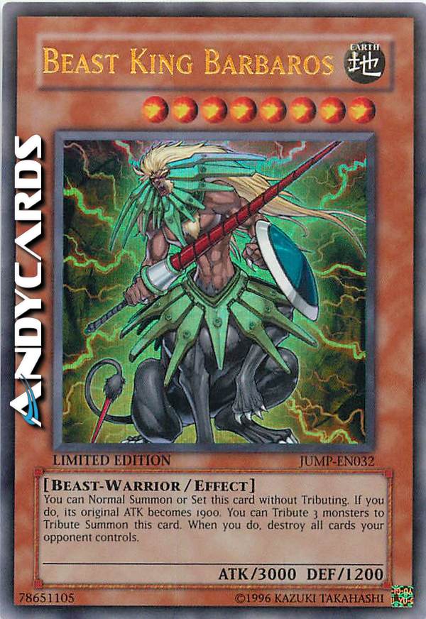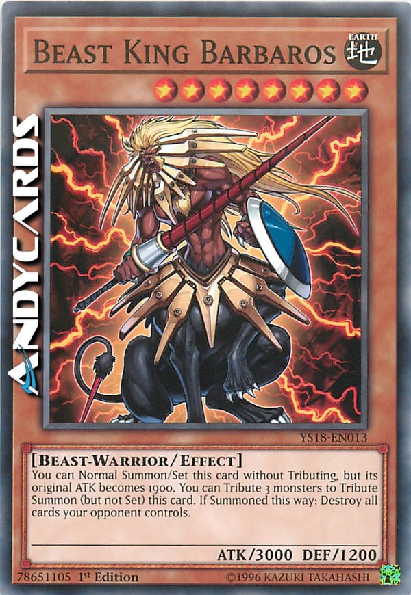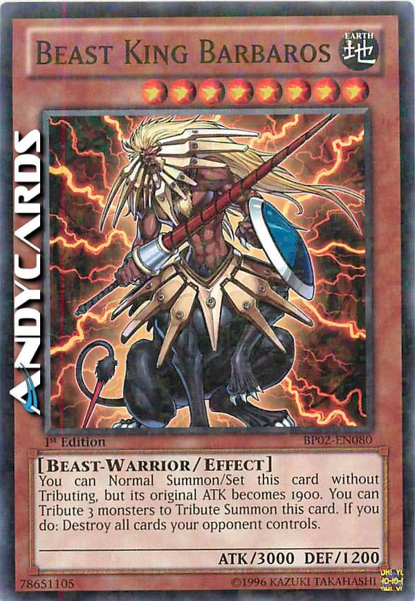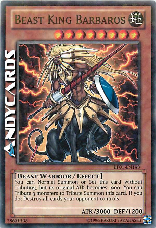 You can Normal Summon/Set this card without Tributing, but its original ATK becomes 1900. You can Tribute 3 monsters to Tribute Summon (but not Set) this card. If Summoned this way: Destroy all cards your opponent controls.