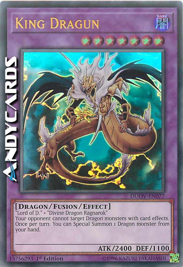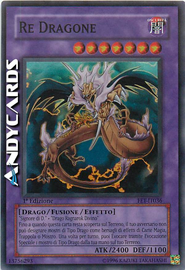 Signore di D. + "Drago Ragnarok Divino" Fino a quando questa carta resta scoperta sul Terreno, il tuo avversario non può designare mostri di Tipo Drago come bersagli di effetti di Carte Magia, Trappola o Mostro. Una volta per turno, puoi Evocare tramite Evocazione Speciale 1 mostro di Tipo Drago dalla tua mano sul tuo Terreno.