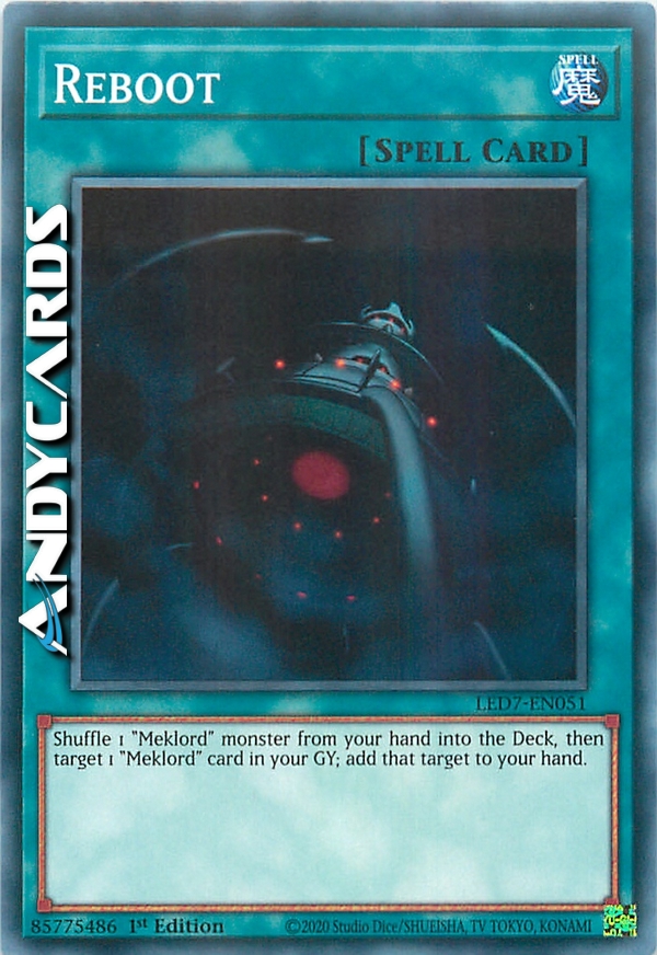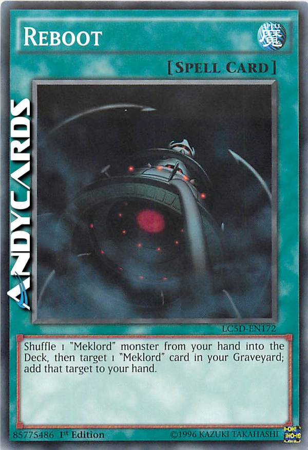 Mischia 1 mostro "Meklord" dalla tua mano nel Deck, poi scegli come bersaglio 1 carta "Meklord" nel tuo Cimitero; aggiungi quel bersaglio alla tua mano.