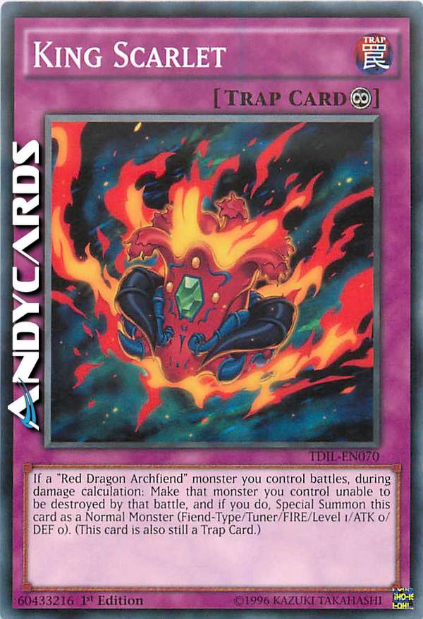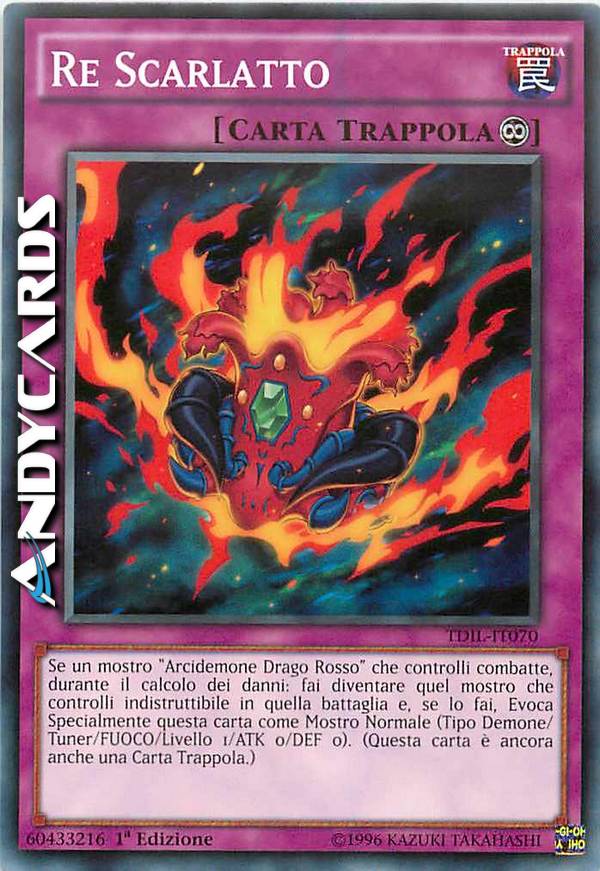 Se un mostro "Arcidemone Drago Rosso" che controlli combatte, durante il calcolo dei danni: fai diventare quel mostro che controlli indistruttibile in quella battaglia e, se lo fai, Evoca Specialmente questa carta come Mostro Normale (Tipo Demone/Tuner/FUOCO/Livello 1/ATK 0/DEF 0). (Questa carta è ancora anche una Carta Trappola.)