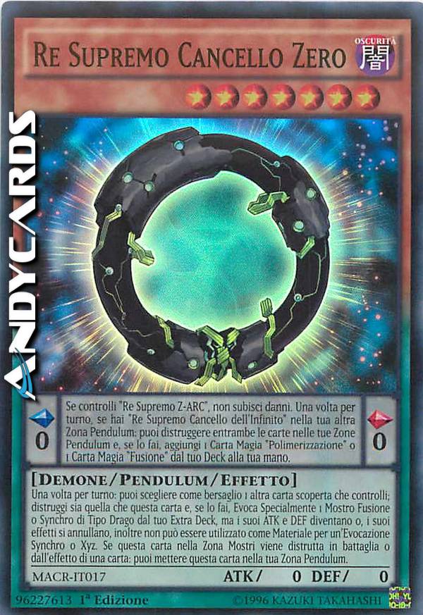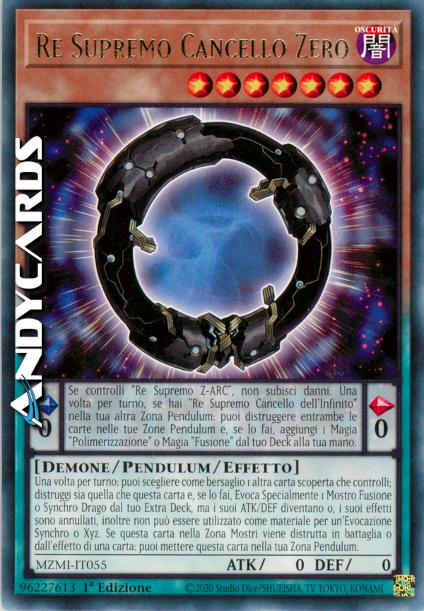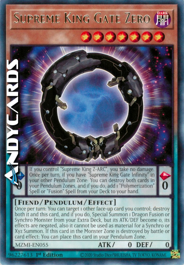 Pendulum Effect: If you control "Supreme King Z-ARC", you take no damage. Once per turn, if you have "Supreme King Gate Infinity" in your other Pendulum Zone: You can destroy both cards in your Pendulum Zones, and if you do, add 1 "Polymerization" Spell or "Fusion" Spell from your Deck to your hand.