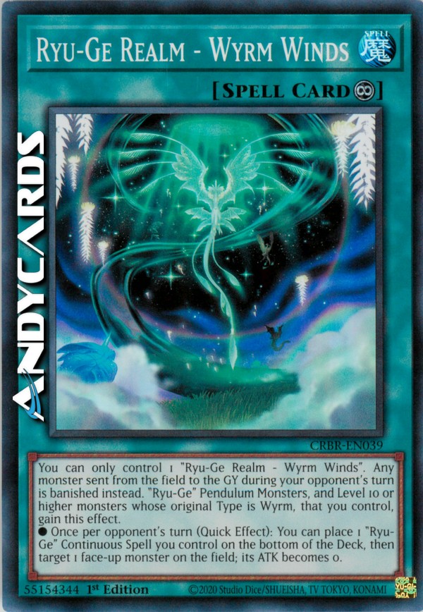 You can only control 1 "Ryu-Ge Realm - Wyrm Winds". Any monster sent from the field to the GY during your opponent's turn is banished instead. "Ryu-Ge" Pendulum Monsters, and Level 10 or higher monsters whose original Type is Wyrm, that you control, gain this effect.