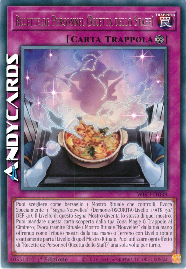 Puoi scegliere come bersaglio 1 Mostro Rituale che controlli; Evoca Specialmente 1 "Segna-Nouvelles" (Demone/OSCURITÀ/Livello 1/ATK 50/DEF 50). Il Livello di questo Segna-Mostro diventa lo stesso di quel mostro. Puoi mandare questa carta scoperta dalla tua Zona Magie & Trappole al Cimitero; Evoca tramite Rituale 1 Mostro Rituale "Nouvelles" dalla tua mano offrendo come Tributo mostri dalla tua mano o Terreno con Livello totale esattamente pari al Livello di quel Mostro Rituale. Puoi utilizzare ogni effetto di "Recette de Personnel (Ricetta dello Staff)" una sola volta per turno.