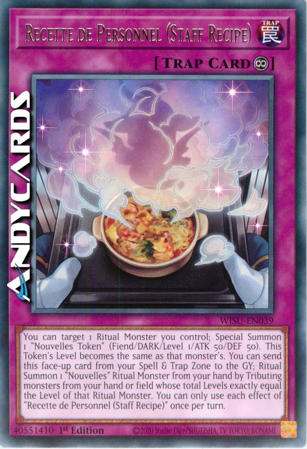 You can target 1 Ritual Monster you control; Special Summon 1 "Nouvelles Token" (Fiend/DARK/Level 1/ATK 50/DEF 50). This Token's Level becomes the same as that monster's. You can send this face-up card from your Spell & Trap Zone to the GY; Ritual Summon 1 "Nouvelles" Ritual Monster from your hand by Tributing monsters from your hand or field whose total Levels exactly equal the Level of that Ritual Monster. You can only use each effect of "Recette de Personnel (Staff Recipe)" once per turn.