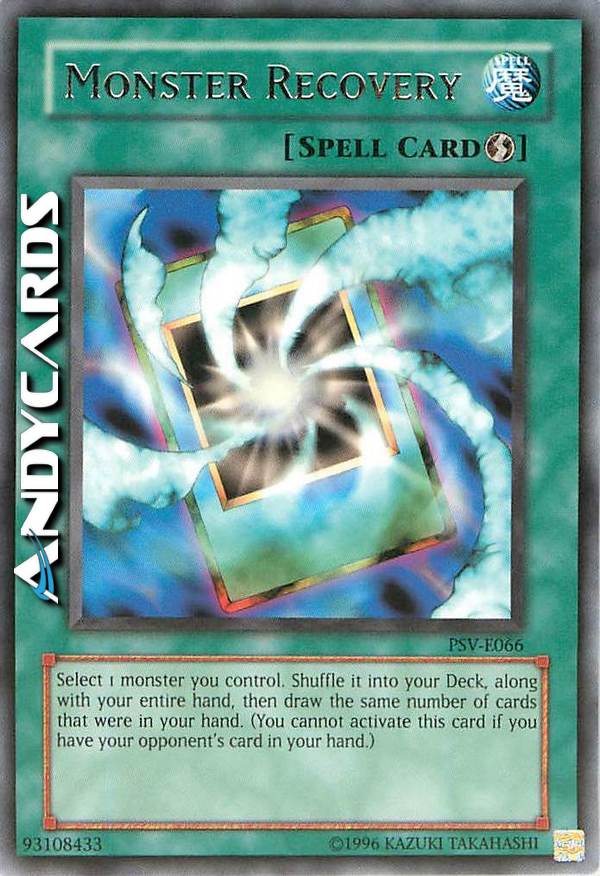Scegli come bersaglio 1 mostro che controlli che possiedi; se quel mostro è ancora sul Terreno, mischia lui e tutta la tua mano nel Deck, inoltre, dopo aver fatto quello, pesca carte pari al numero di carte che hai mischiato dalla tua mano nel Deck per questo effetto. (Non puoi attivare questa carta se hai nella tua mano una carta di cui il tuo avversario è il possessore.)