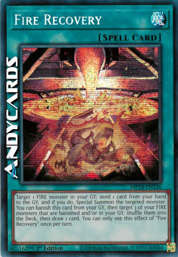 Scegli come bersaglio 1 mostro FUOCO nel tuo Cimitero; manda 1 carta dalla tua mano al Cimitero e, se lo fai, Evoca Specialmente il mostro scelto come bersaglio. Puoi bandire questa carta dal tuo Cimitero, poi scegliere come bersaglio 3 dei tuoi mostri FUOCO che sono banditi e/o nel tuo Cimitero; mischiali nel Deck, poi pesca 1 carta. Puoi utilizzare questo effetto di "Recupero del Fuoco" una sola volta per turno.